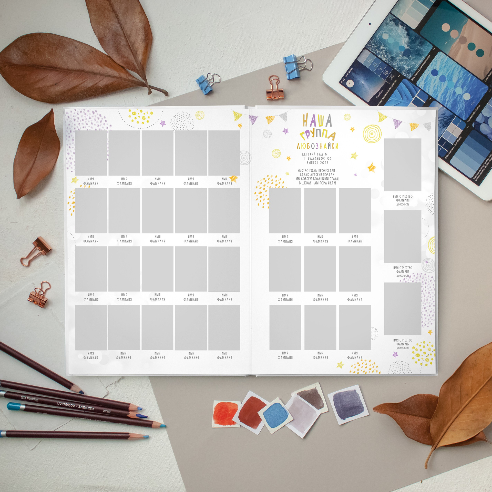 - второй разворот: индивидуальный разворот ребенка: портрет и 2 фотографии с друзьями