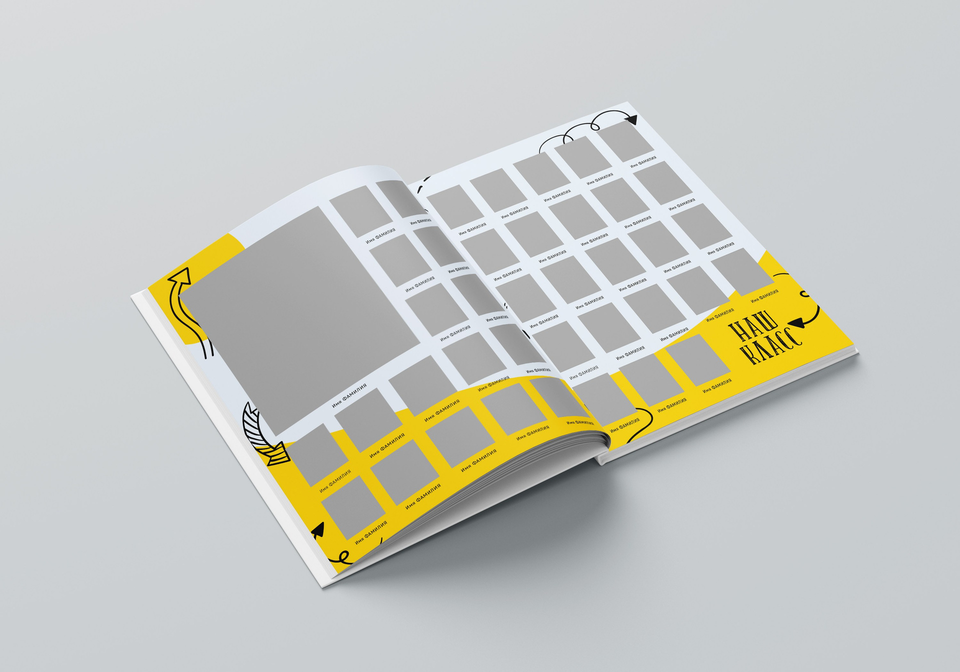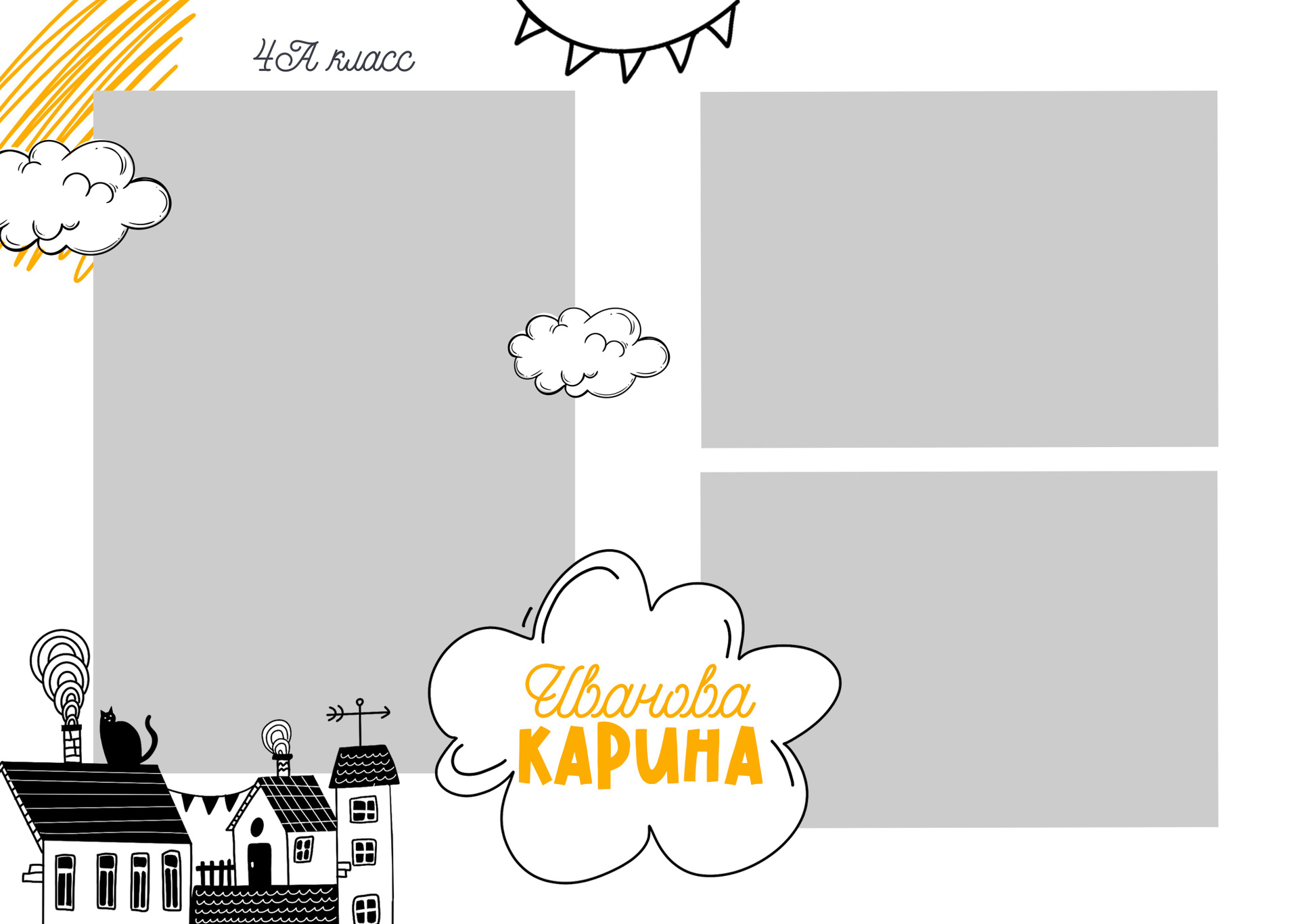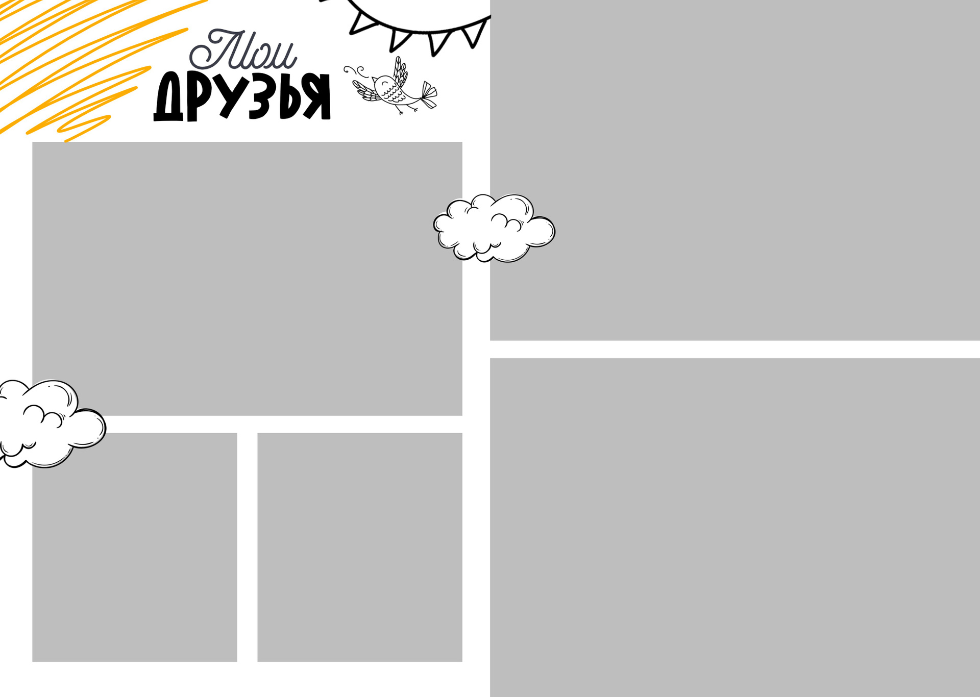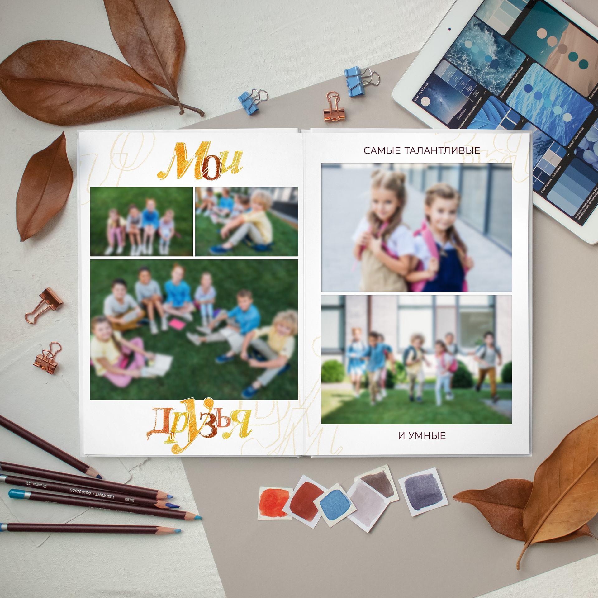 - второй разворот: индивидуальный разворот ребенка: портрет и 2 фотографии с друзьями