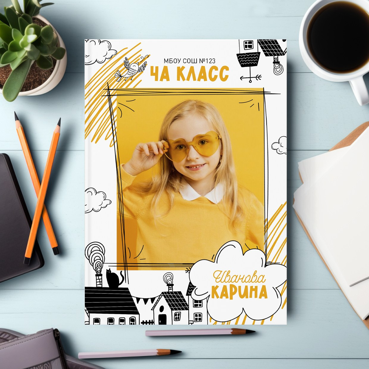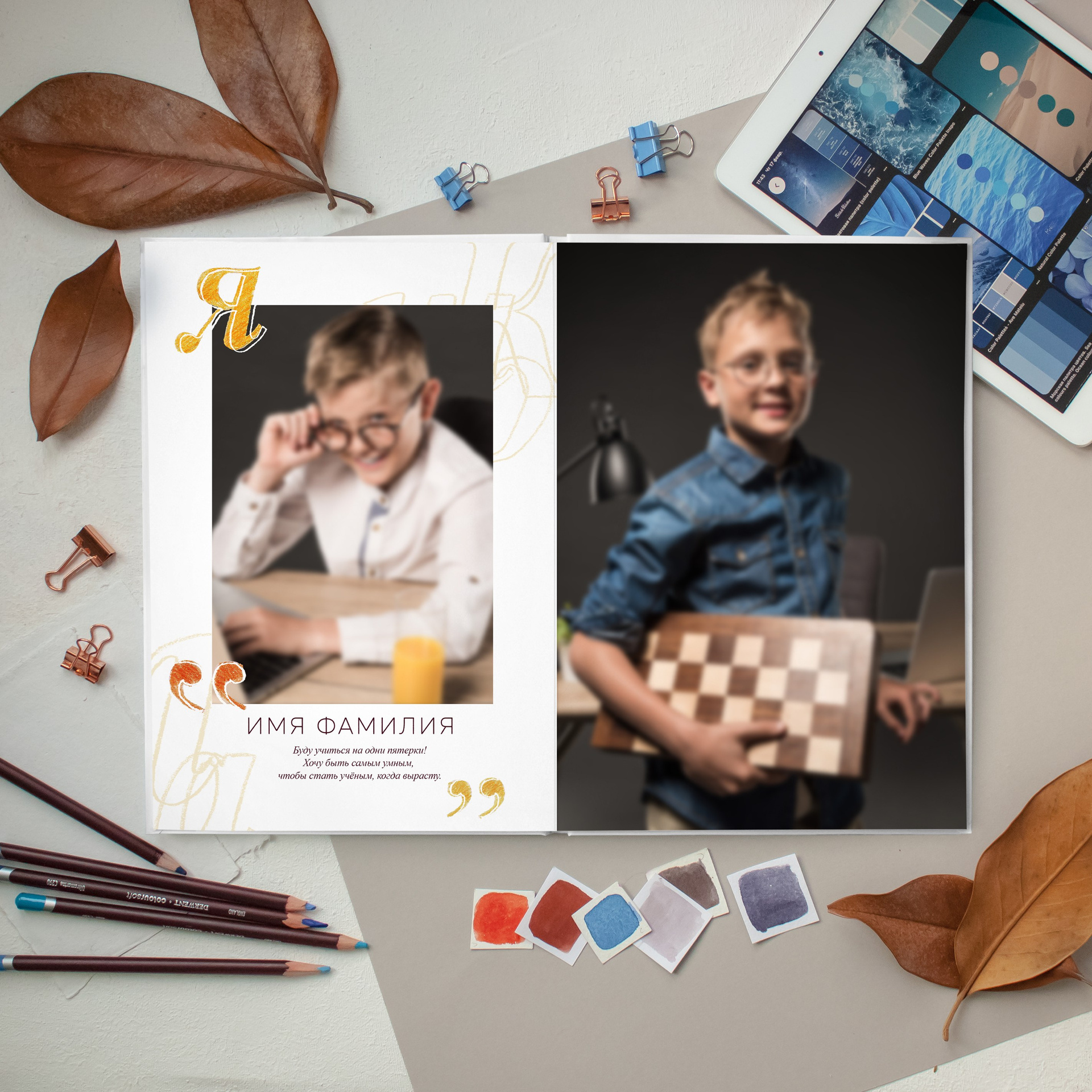 Выпускной альбом «Общий» можно разнообразить дополнительными разворотами и включить предоставленные вами фотографии из прошлых лет. Также можно включить напутственные слова от учителя или рассказать об увлечениях ребёнка. Стоимость рассчитывается индивидуально.